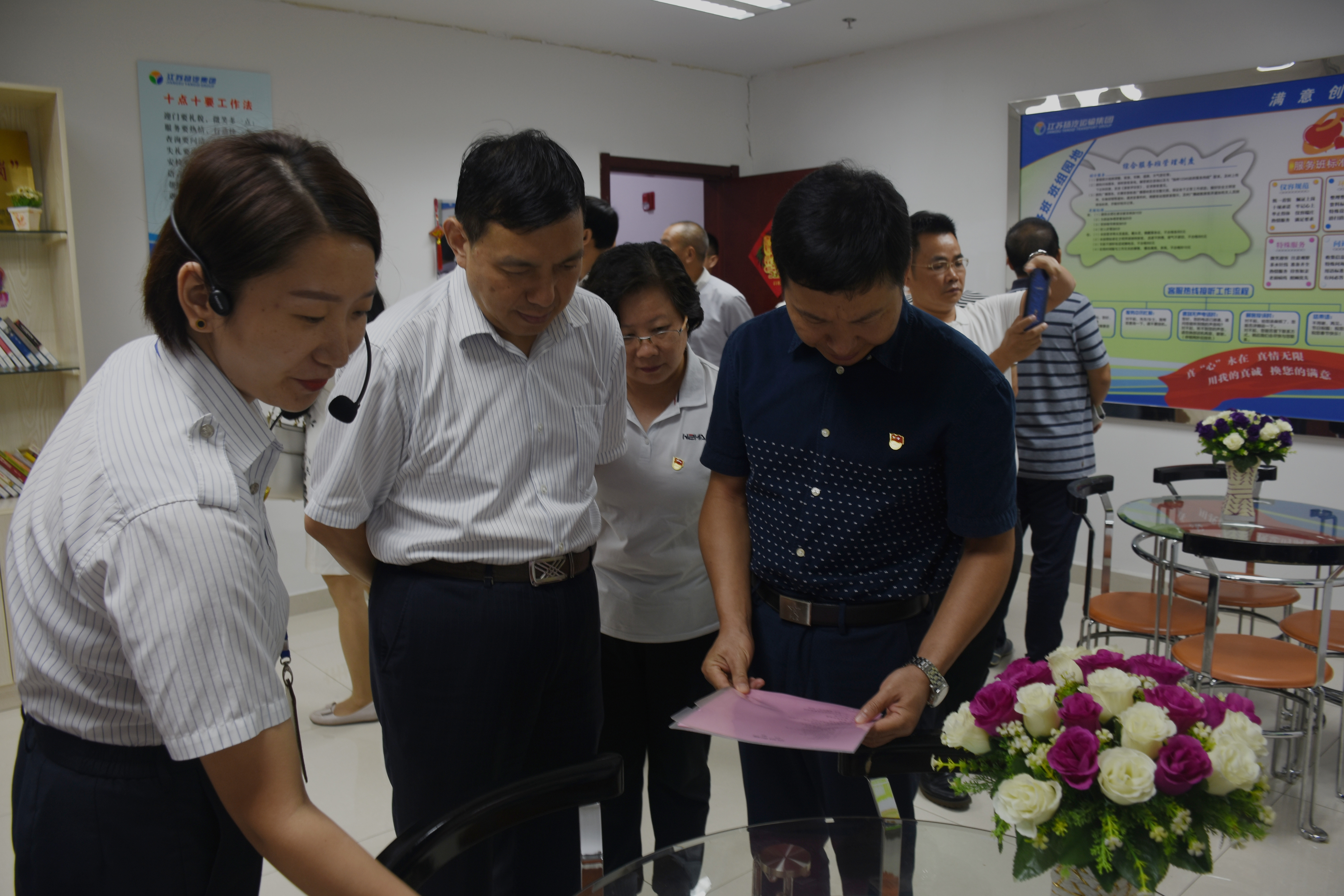 參觀團(tuán)一行首先來到揚(yáng)州汽車站黨建陣地,查看了黨建宣傳欄、黨務(wù)公開欄、黨建文化照片墻等,在現(xiàn)場,揚(yáng)州站站長和書記分別介紹了揚(yáng)州汽車站“黨員示范崗”服務(wù)流程、服務(wù)特色和車站黨支部開展黨建工作的基本情況,重點(diǎn)分享了揚(yáng)州汽車站作為傳統(tǒng)客運(yùn)企業(yè)在面對脫困轉(zhuǎn)型時如何發(fā)揮支部的戰(zhàn)斗堡壘作用和黨員的先鋒模范作用。隨后,參觀團(tuán)一行走進(jìn)服務(wù)班和售票班組活動室現(xiàn)場感受車站黨建工作與班組創(chuàng)建的有機(jī)融合,對支部臺帳、開展活動的形式等多個方面進(jìn)行了交流與探討,分享各自優(yōu)秀的黨建工作經(jīng)驗(yàn)和做法,共同提升新時期黨建工作水平。