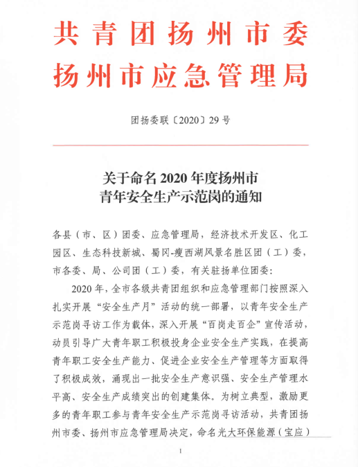 2020年,揚汽集團修理廠維護班切實落實“安全第一、服務(wù)第一、質(zhì)量第一”總目標,以突出的成績,被共青團揚州市委與揚州市應(yīng)急管理局授予“揚州市青年安全生產(chǎn)示范崗”稱號。