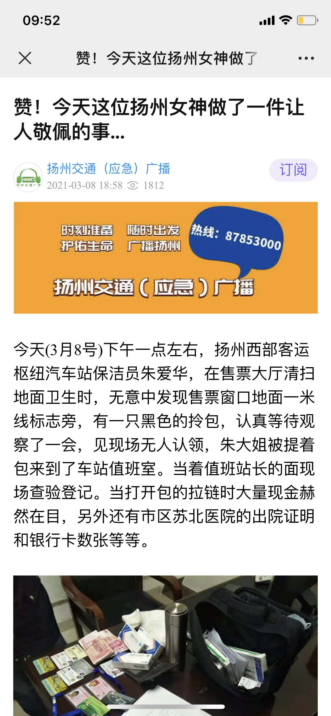 3月8日下午1點左右,揚州站物業(yè)保潔員朱愛華在售票大廳窗口地下?lián)斓揭粋旅客遺忘的拎包,她第一時間交到站長值班室,由值班站長通知廣播室進(jìn)行失物招領(lǐng)廣播,直至下午3點未見人員領(lǐng)取,車站按照公司規(guī)定,在相關(guān)工作人員見證下,打開了手提包,里面有老年公交卡兩張,銀行卡若干,現(xiàn)金一萬多元,若干藥品,出院材料一份,通訊簿一個,車站工作人員打開通訊簿進(jìn)行聯(lián)系,但一直未聯(lián)系上失主本人,幾經(jīng)周折,后來通過出院材料,聯(lián)系上失主的孫女楊女士。原來她的奶奶身體不好,老伴陪她從老家興化到揚州治病,今天剛從蘇北醫(yī)院出院,沒料到隨身帶的包竟然丟了,正在一籌莫展之時,接到車站失物招領(lǐng)電話的楊女士欣喜萬分,并立即趕往車站確認(rèn),車站工作人員對失主身份信息以及代領(lǐng)人身份信息進(jìn)行核實,確認(rèn)無誤后,進(jìn)行了失物招領(lǐng)手續(xù)辦理,最后將包交由楊女士。拿到包后楊女士握著保潔阿姨的手連聲說謝,還要送錦旗表揚揚州站的保潔及工作人員,弘揚拾金不昧、助人為樂社會正能量。