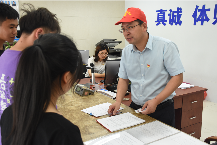 在報名大廳的服務(wù)現(xiàn)場,龔宇峰為前來學(xué)駕的學(xué)員登記報名信息,辦理手續(xù),并與他們交談,耐心解答他們的問題、囑咐在學(xué)習(xí)駕駛過程中需要注意的事項。