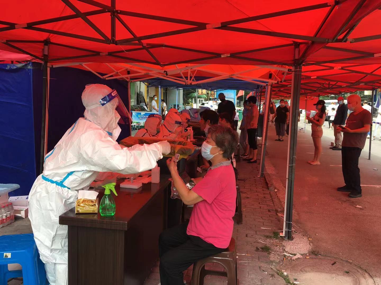 隨著時(shí)間的推延,戶外炎熱難耐,不是親身經(jīng)歷,真難以想象沖在第一線的醫(yī)護(hù)人員是怎么熬過來的。為時(shí)近幾個(gè)小時(shí)的這段艱難時(shí)光中,我好幾次覺得自己快缺氧窒息了,不過看著其他志愿者送來的降溫冰塊,給我們?nèi)韲姙⒕凭禍,誰又何嘗不是負(fù)重前行呢?在一次次鼓勵(lì)加油中,終于完成了上午的核酸檢測(cè)任務(wù),當(dāng)我脫下防護(hù)服后,衣服可以擠出水來,雙手被汗?jié)n泡的發(fā)白。同時(shí),排隊(duì)做核酸的居民也很辛苦,個(gè)個(gè)汗流浹背,他們聽從指揮,秩序井然,有的向我們問候,“你們也辛苦了!”,心里很是感動(dòng)。