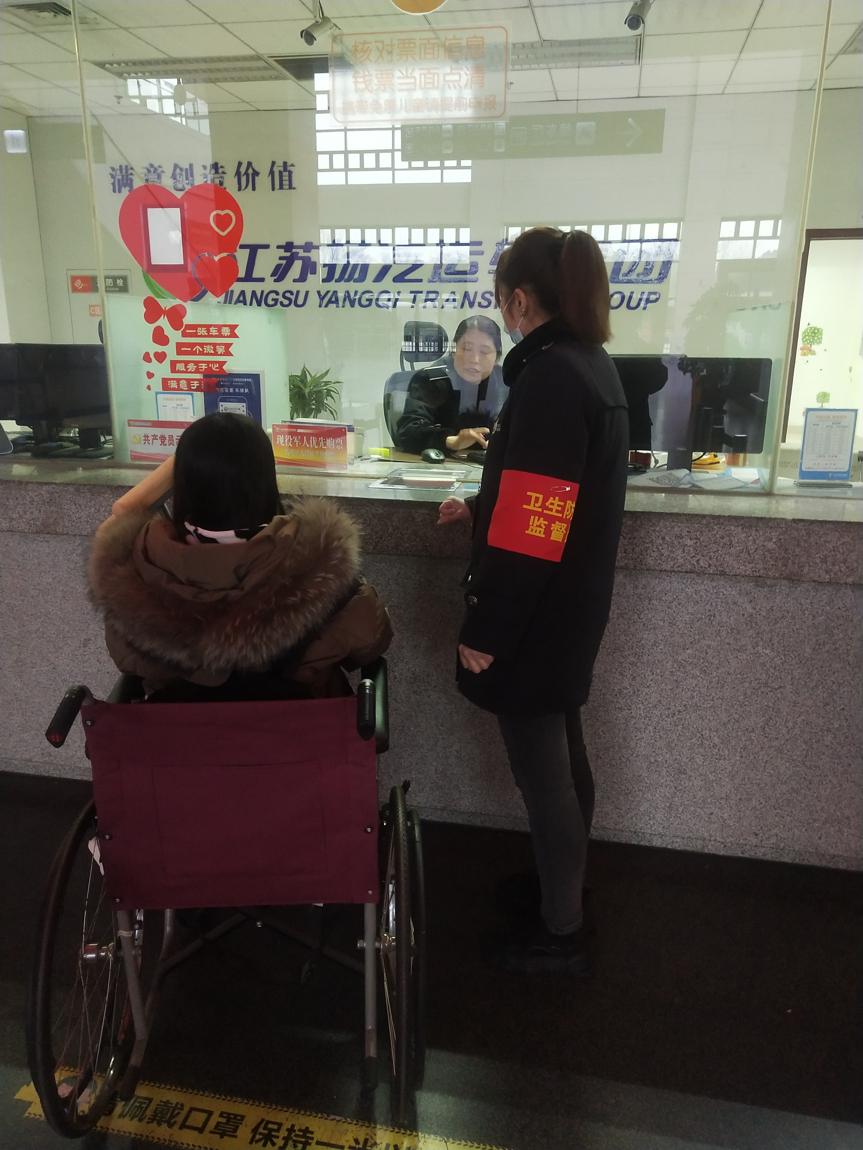 周俊云班長讓她稍等會,就幫她推來了車站里提供的輪椅,讓她坐在輪椅上面推她去售票窗口買票,還很熱心的一直送到重點旅客無障礙直升電梯里面,然后再送到二樓檢票口,直到幫助這位旅客上了車,臨走前還對旅客說一句一路順風(fēng)。