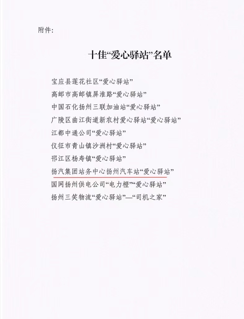 揚(yáng)州汽車(chē)客運(yùn)站榮獲市總工會(huì)十佳“愛(ài)心驛站”榮譽(yù)稱(chēng)號(hào)