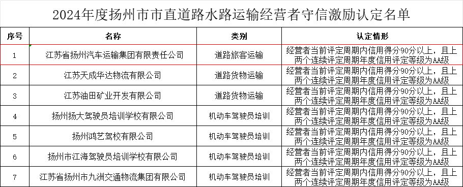 根據(jù)《江蘇省交通運(yùn)輸行業(yè)信用管理辦法》、《江蘇省道路水路運(yùn)輸經(jīng)營者信用管理辦法》等文件要求,經(jīng)評審、公示等程序,近日,揚(yáng)州市交通運(yùn)輸局發(fā)布認(rèn)定公告,揚(yáng)汽集團(tuán)獲2024年度揚(yáng)州市市直道路運(yùn)輸經(jīng)營者守信激勵名單認(rèn)定。